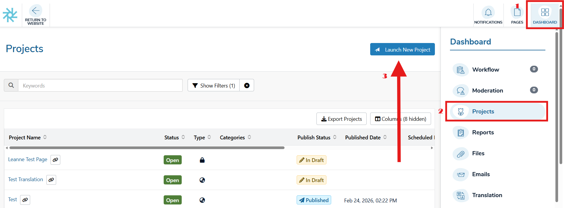 Fill out the three pages of details of the project (project name, URL, etc.) and then click the Launch Project button. Once you have launched your project, it will take you to the draft project page where you can start editing and adding content.