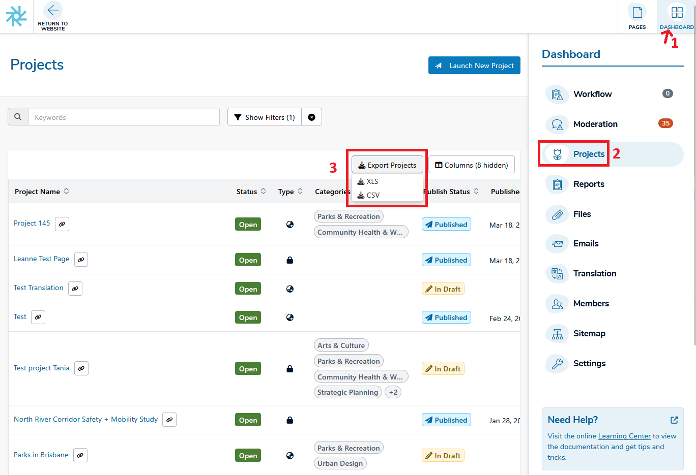 Projects are managed in the Projects section of the Dashboard, where you can: