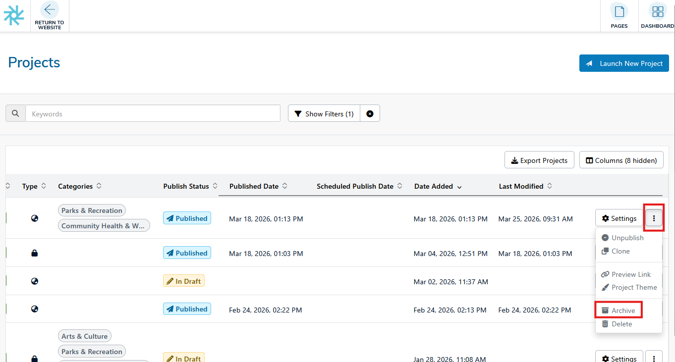 When you launch a new project, the project is automatically listed in any relevant project list tools. In some cases, you may want to hide a project so it is no longer visible in a project list.