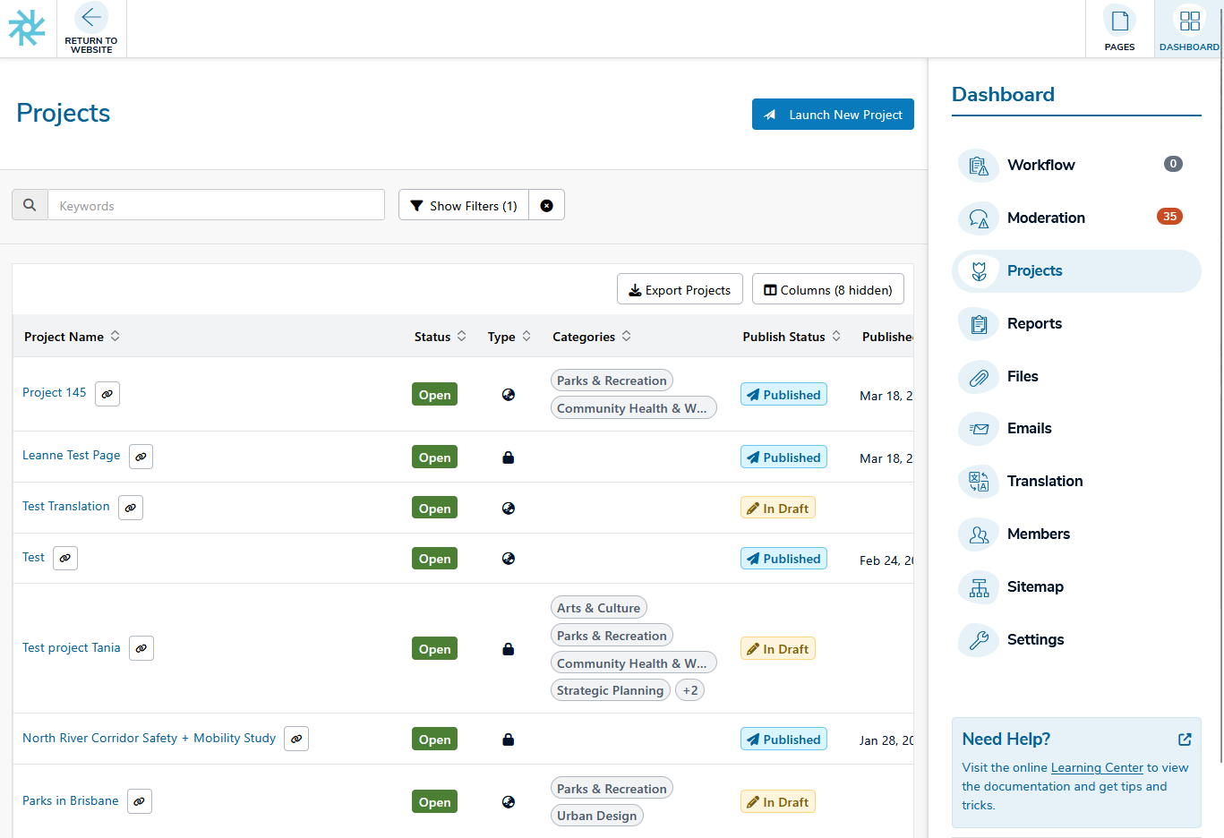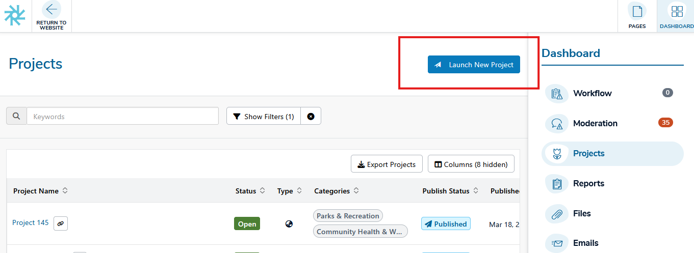 The Projects section of the Dashboard lists all current projects, including drafts that haven’t been published yet. Projects are displayed in a table with key details like name, status, categories, and launch date.