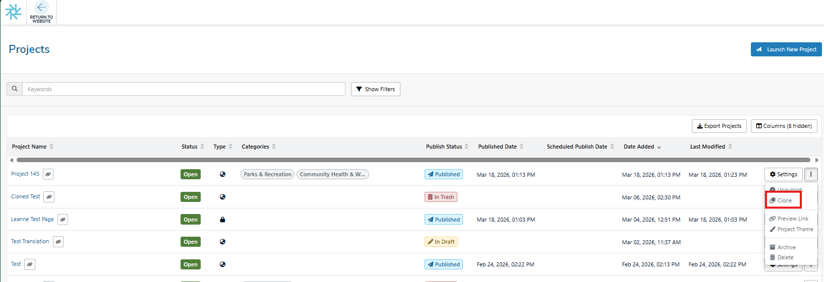 - The project and all child pages will be set to Draft, with child pages linked to the cloned project. (Each cloned subpage will need to be individually published.)